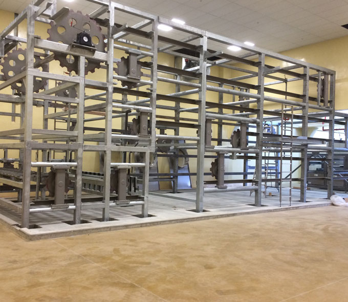 Dale’s spiral first provers are used on the makeup side of the process and transport dough in either single file or in double lane format depending upon plant capacity. Dough is gently pulled away from the belt at discharge via a stripping roller arrangement and then placed into a flip flop chute whereby dough is flipped onto one or the other separate conveyors leading to the mouth of each moulder.